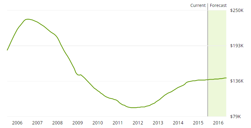 It’s clear that investing in Orlando property yields superior rental income, but the other variable is capital appreciation. As seen in Figure 3, the Florida housing market is rebounding slowly, as the market in Orlando is far from its highs. Zillow projects a modest 2.2% increase in housing prices in Orlando in 2016. As for Toronto, housing prices continue to rise steadily higher, despite concerns of a bubble.