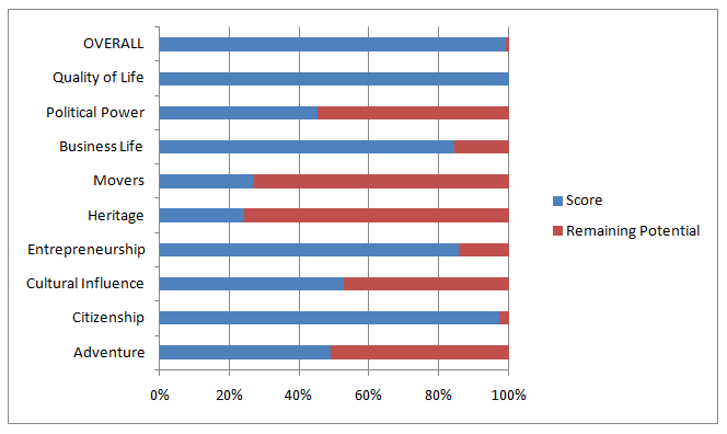 The country ranks very high in work culture categories such as entrepreneurship and business life, and it more than makes up for its relative lack of cultural heritage with a strong sense of citizenship. For a more detailed description that contains category breakdowns, we recommend visiting the links provided.